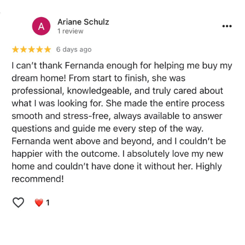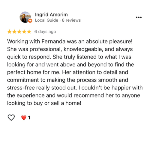 Having amassed over 15 years of experience in negotiation, sales, and customer service, Fernanda boasts a diverse clientele spanning from first-time homebuyers, sellers to prominent international investors.